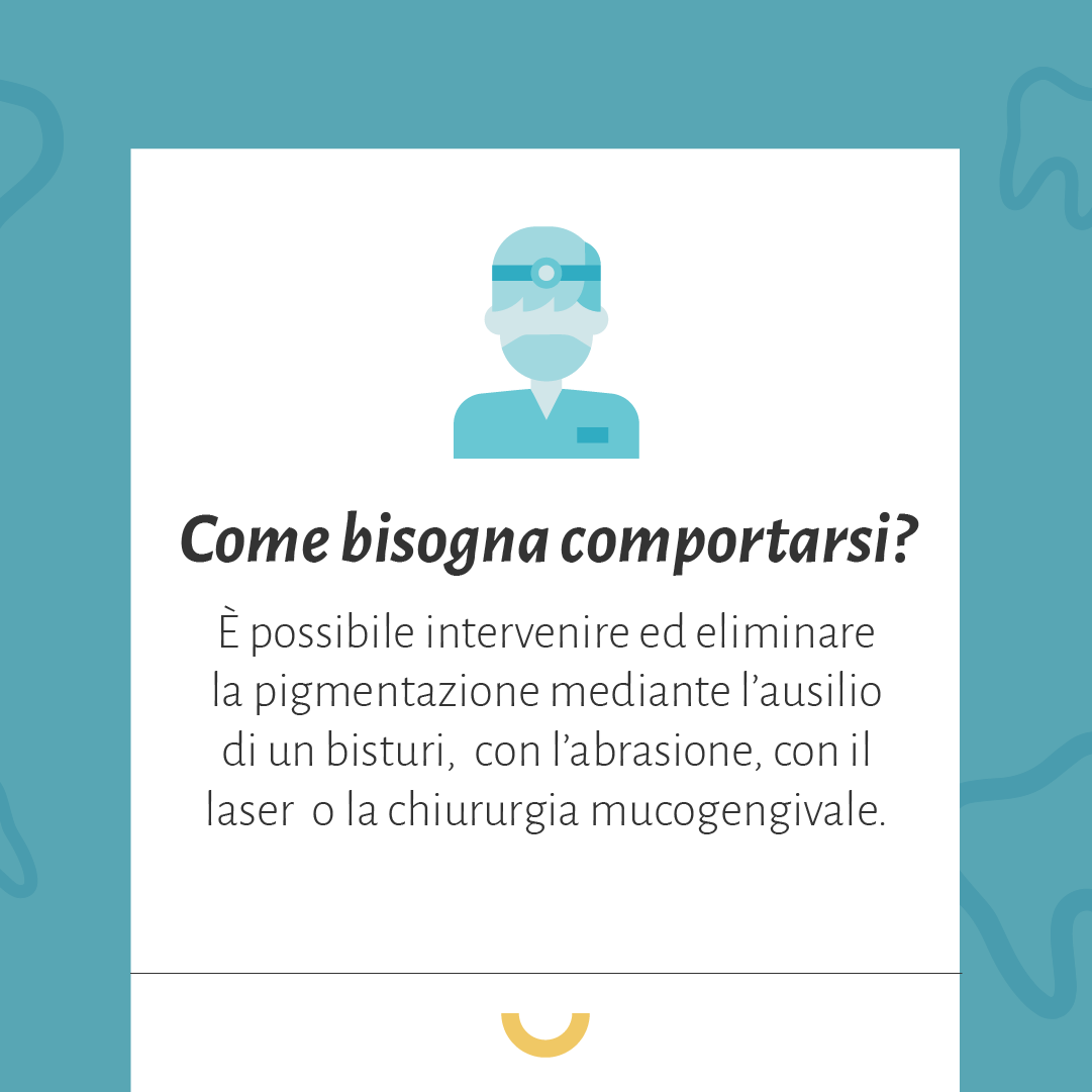 Qualora l’alterazione del colore gengivale per lo più di origine fisiologica, rappresenti un inestetismo per il sorriso, è possibile intervenire ed eliminare la pigmentazione.